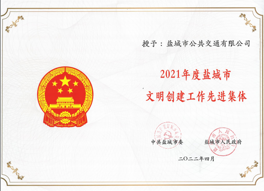 - 2022年4月公司被授予2021年度鹽城市文明創(chuàng)建工作先進(jìn)集體榮譽(yù)稱號